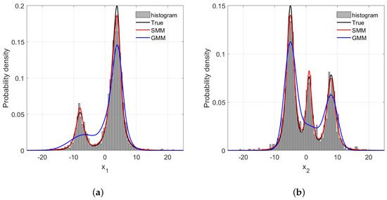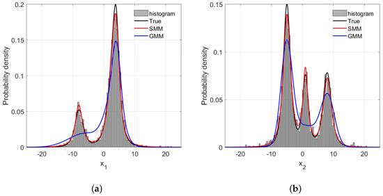 We assume a 2-dimensional input variables and a scalar output y are generated from a mixture of three Student’s-t distributions based on Equations (3) and (12), in which the configurations of each component are listed in Table 1. Please note that as the non-diagonal elements for the precision matrices are not zero, the correlations among the input variables are taken into consideration, which can be captured by the proposed model using Equation (3). In addition, in our model setting, the vector is assumed to obey a mixture of multivariate Student’s-t distributions, and we do not need to build one SMM for each of variable. Figure 3 illustrates the data distributions from the input space, which clearly shows the multimode characteristics.