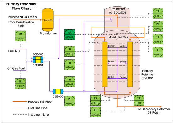 The primary reformer is an important part of hydrogen-manufacturing units in the ammonia synthesis process for producing NH3, which is the main material in the urea synthesis process. The flowchart of the primary reformer is illustrated in Figure 8.