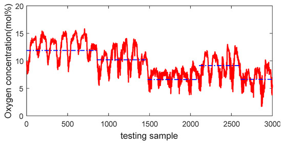 A total of 7000 samples recorded from January 2015 to July 2015 were collected from the database of distributed control systems of a real-world primary. The collected samples are evenly partitioned into three parts, i.e., 2000 samples serve as the training dataset, 2000 samples are used as the validating dataset for model selection, and the remaining 3000 samples constitute the testing dataset for evaluating the generalization performance of various soft sensors. By taking the testing samples, for example, it is obvious that the process basically involves five large operating conditions, as shown by the dash-dot blue line in Figure 9, which indicates that the primary reformer is characterized by multiple modes.