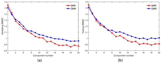 As with the numerical example, the order of the Multi-DPLS is determined as 3, and Figure 10 shows that the number of components and the dimensionality of latent space are determined as 12 and 8, respectively, in which the Multi-DPLS has the minimum RMSE on the validating dataset. In addition, the initial values of model parameters for the GMR and SMR-based soft sensors, as well as the model selections for them are also completed on the validating dataset. In particular, the best performances for the GMR and SMR-based soft sensors with various numbers of mixing components (i.e., K) are visualized in Figure 11a, which indicates that both the predictive RMSEs of GMR and SMR-based soft sensors reach the minimum at . However, for the SMR-based soft sensor, we see that as , the validating RMSE almost stabilize at . Considering the fact that the larger the K, the higher the model complexity, we determine the optimal K for the SMR-based soft sensor as 15. Based on the same consideration, the optimal K for the GMR-based soft sensor is selected as 18. Meanwhile, for the GMR and SMR-based soft sensors, the generalization performances on the testing dataset are compared in Figure 11b.