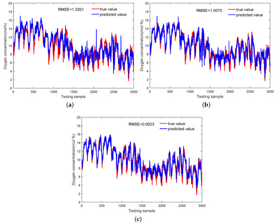 Predictions of the oxygen concentration achieved by: (a) Multi-DPLS, (b) GMR, (c) SMR.