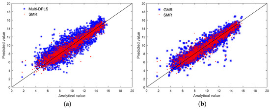 Scatter plot comparisons for estimating the concentration of O2: (a) Multi-DPLS and SMR; (b) GMR and SMR.