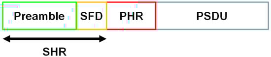 The UWB PHY frame format is formed by the synchronization header (SHR), the physical layer header (PHR), and the physical layer service data unit. (PSDU), respectively, as shown in Figure 1 []. The PSDU contains the MAC protocol data unit (MPDU) and the BCH parity bits. The PSDU can therefore be regarded as the payload. The information contained by the PHR includes the data rate of the PSDU and the length of the MAC frame body, and the SHR contains the preamble used for timing synchronization, packet detection, and other purposes, and the start-of-frame delimiter (SFD) for frame synchronization. This research mainly focused on the performance of the payload (PSDU).