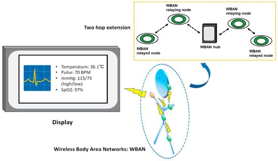 An example smart health care monitoring system that includes a WBAN with a two-hop extended star network topology is shown in Figure 2. As can be seen, vital information obtained by WBAN nodes is displayed on a monitoring unit through a WBAN hub.