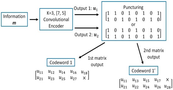 In a previous study, an optimal QoS control scheme that employs decomposable error control coding and Weldon’s ARQ scheme was proposed [,,]. As an example of the decomposable code, punctured convolutional code (constraint length ; coding rates are 8/9 to 1/16) is used. The punctured code patterns (codeword 1 and codeword 1’) are generated from a convolutional code whose generator polynomial is [,] and the coding rate is = 1/2 as shown in Figure 3.