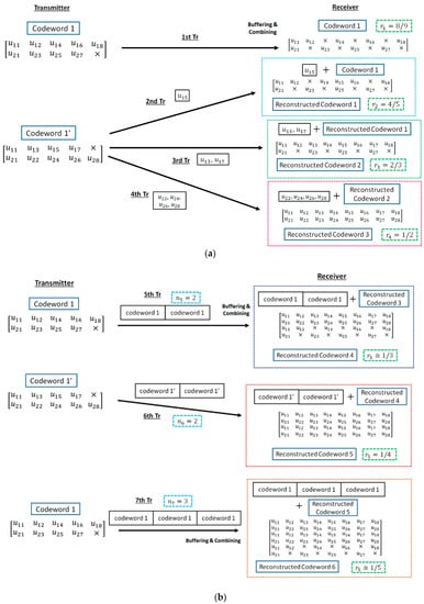 - If bit errors are detected after decoding codeword 1, the receiver stores the transmitted codeword 1, and the transmitter re-sends the sub-codeword of codeword 1′ times if . At the receiver, the received sub-codeword and stored codeword are combined, and the reconstructed codeword is decoded.
