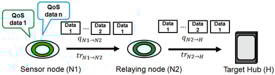 It is assumed that a sensor node (N1) includes multiple sensors that produce different data types that are transmitted via a relaying node (N2) to the target hub (H) (Figure 6). Here, is the number of transmissions from nodes A to B and is the maximum number of transmissions from nodes A to B. If bit errors are detected, the system retransmits until the maximum number of retransmissions is reached. Then, the transmission is considered to have failed if the data from a sensor node do not reach the target hub.