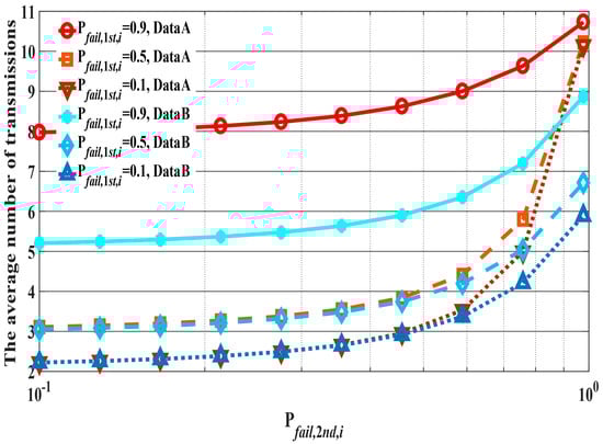 Then, each is set as shown in Table 2. The maximum number of retransmissions is four in high QoS mode in the IR-UWB (impulse radio ultra-wideband) PHY of the standard. However, the default mode in the IR-UWB PHY, the narrowband PHY, and the Human Body Communication PHY in IEEE Std. 802.15.6 do not define a maximum number of retransmissions. Thus, in the current study, this parameter was set according to the QoS requirements of the data in our previous work [,,]. Figure 7 shows examples of each . and denote the probability of transmission failure at the th transmission of the first and second hop, respectively. With Data A, increases steeply under high conditions, especially in low cases, because increases towards as increases. On the other hand, increases gradually with Data B because and are constant.