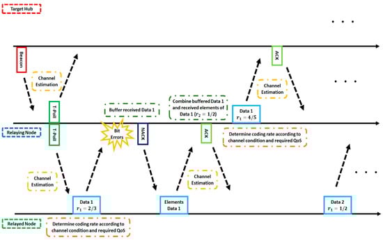 In this study, two proposed schemes are assumed. The first scheme (Scheme 1) transmits data depending on preset parameters, which was used in our previous study [,,]. On the other hand, in the second scheme (Scheme 2), coding rates are varied with the SNR estimated using a preamble signal according to each QoS requirement (e.g., desired bit error ratio (BER)), which is introduced for the first time in this manuscript. The operation example is shown in Figure 8. Firstly, the channel SNR is estimated by using the preamble of the beacon or the T-Poll received from the hub or the relaying node. Next, the relayed node or the relaying node determines the coding rate according to the estimated channel SNR and transmits data to the relaying node or the hub. If a bit error is detected, elements of the encoded data (codeword) are transmitted to increase error correcting capability after receiving negative-acknowledgement (NACK). Then, if data are transmitted successfully, the channel SNR is estimated by using the returned acknowledgement (ACK) preamble, the coding rate is determined, and the next data are sent. Since Scheme 2 uses an existing preamble, extra overhead is not required.