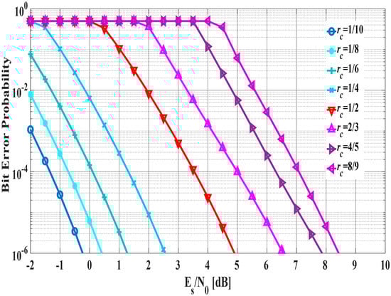 where is length of information bits. Hence, the desired BER is calculated from the desired PER such as Table 1 and . The coding rate is determined based on that and the estimated SNR from Figure 9. As the reason for using the desired PER and , it is possible to accurately obtain the desired BER for determining the coding rate from the Equation (14) since the required QoS (desired PER) is used. For example, in a case where the desired PER is and is 400 bits, the desired BER is calculated as . Here, if the estimated SNR is 5 dB, the coding rate is determined to be = 1/2 as shown in Figure 9.