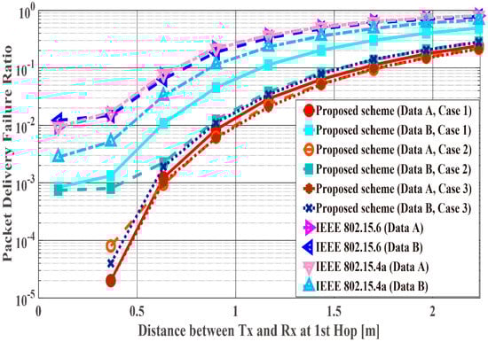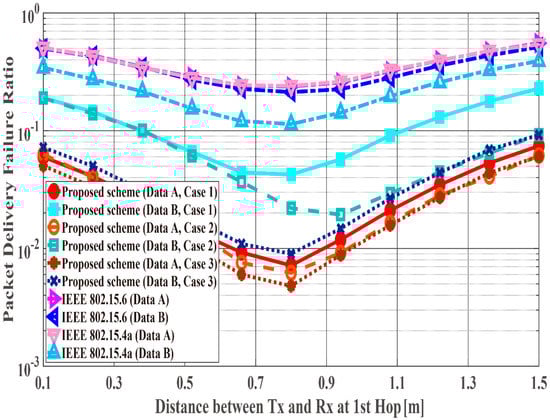 Figure 14, Figure 15 and Figure 16 show the performance results for fixed communication distance in two hops + (1.5 m) and varying the and values. For = 1.5 m, data are transmitted using only a single hop. Thus, the proposed scheme satisfies the QoS requirements for Data A and B, while both standard schemes approach do not, like in the first scenario. Also, when comparing the standard schemes and the proposed scheme, the performances of both standards are worse than the proposed one. For example, Data A of the proposed scheme satisfies PDFR <, while that of both standards do not satisfy PDFR <. This is because the correcting capability of error correcting codes used in those standards is lower than that of the proposed scheme. In other words, the standard schemes do not have sufficient correcting capability in a hop with poor channel conditions. Comparing Case 1 and Case 2, it is understood that Case 2 has better characteristics. The reason is that Case 2 can select a coding rate suitable for the channel condition by using Scheme 2 at the second hop. On the other hand, regarding Case 1, since Scheme 1 is used at both hops, it is considered that a hop having a bad channel condition is greatly affected. Then, Case 3 shows the best performance because Scheme 2 is used at both hops. In addition, all systems except Case 2 of the proposed scheme show the best performance when the communication distance of the first hop equals that of the second hop because or becomes long (unlike the previous condition) and the long-distance communication influences performance in other cases.