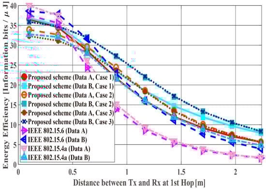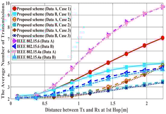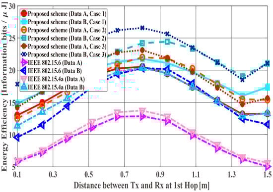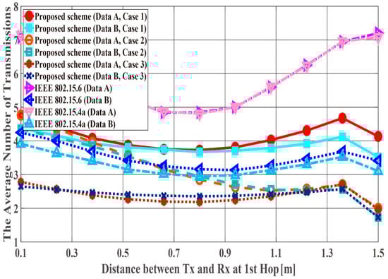Figure 11, Figure 12 and Figure 13 show the performance results when the distance of the first hop is changed from 10 centimeters (cm) to 3 m and the distance of the second hop is constant ( = 40 cm). In this scenario, it can be said that the performance in the range in which the WBAN mainly operates (10 cm~1.5 m) and certain limitations of the WBAN system (1.5 m~2.3 m) are evaluated. PDFR means the ratio at which the two-hop relay failed beyond the maximum number of retransmissions. As can be seen, the proposed scheme satisfies the QoS requirements for data A and B as shown in Table 1, while IEEE Std. 802.15.6 and 15.4a do not. Hence, the proposed method can improve PER of Data A more, while it can improve the energy efficiency and the number of transmissions of Data B more. Conversely, Data B has better performances with respect to both standard schemes. The reason is that those standard schemes are not basically designed so that any QoSs can be satisfied. Hence, it can be considered that the performances of each mode of IEEE Std. 802.15.6 and error control schemes of IEEE Std. 802.15.4a were simply expressed. Also, that is one of problems of these standard schemes. Cases 2 and 3 show better energy efficiency and average number of transmissions than Case 1, because the coding rate of Case 2 and Case 3 is set appropriately for the channel SNR and the number of retransmissions is reduced by utilizing Scheme 2, while Case 1 uses only Scheme 1 and it requires a larger number of retransmissions. However, there is not a large difference between Cases 2 and 3 because is short and the error correcting capability of coding rate = 8/9 at the first transmission can reduce bit errors sufficiently. That is, there is no large difference between Schemes 1 and 2 with respect to the second hop.
