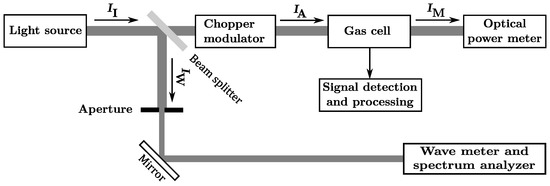 The experimental setup schematically illustrated in Figure 1 is mounted on an optical table. In order to provide an intense light source in the infrared wavelength regime, a continuous wave (cw) OPO is used. The OPO supplies coherent IR radiation in an automatically tunable range between and with an average step width of of . Because the OPO output power P changes in a wide range between 0.8 W to 1.6 W, depending on wavelength tuning, P has to be measured continuously to allow signal normalization. The original idler beam was split into two by a beam splitter. The strongest beam component with was guided to the chopper modulator which consisted of a motor-driven disc with windows providing a square wave amplitude modulation at a 50% duty cycle. The modulation frequency was aligned to the fundamental longitudinal resonance frequency of a H-type sample gas cell, depicted in Figure 2, of with a full-width-half-maximum (FWHM) of at room temperature, resulting in a Q-factor of 27. During the measurements, the temperature drift and the frequency variation of caused a worst case maximum deviation from the cell resonance frequency of . With respect to the frequency response curve of the gas cell, the mismatch could result in a maximum acoustic signal loss of 32%. Due to the fact that the measured spectra should be compared with the shapes of reference spectra and that the measured gas samples are well known, the deduction of absolute quantities of molecules was not in the focus of interest. Therefore, the signal loss due to frequency mismatch could be considered in the comparison with reference spectra. If a quantitative evaluation of unknown gas samples would have been the aim, it would have been appropriate to use a differential chamber cell instead of a simple H-type gas cell, e.g., to allow an in situ calibration with a reference.