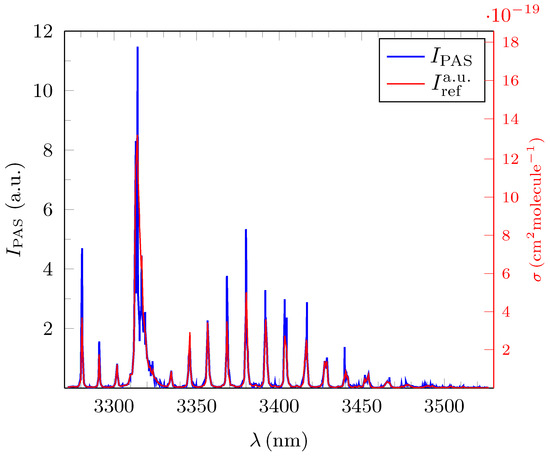 Figure 4, Figure 5 and Figure 6 show the experimentally obtained PAS absorption signal intensities in arbitrary units (a.u.) for methane, ethane and propane at ∼100 ppm together with their normalized standard reference spectra as calculated from the absorption cross sections depicted in HITRAN. The y-abscissa on the right (red) of each of these figures represents the standard unit of and relates to the calculated absorption cross sections for each of the three test gases from which the corresponding were derived. All measured spectra were taken under normal atmospheric temperature and pressure conditions.