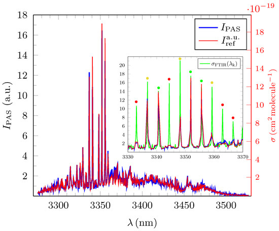 It is crucial to note that for ethane the measured PAS spectrum does not resolve all of the rather sharp resonances which are clearly visible in the precise . Some of the resonances are heavily truncated or simply not resolved due to the given distribution of the around the resonance peaks amplitude. The inset in Figure 5 shows the wavelength region between and which is dominated by sharp resonances at specific wavelengths that are resolved accurately with a resolution of by FTIR. The appropriately rescaled high resolution from HITRAN is depicted in green. Due to the non-continuous varying step sizes , of the OPO, a total of four of the 10 prominent resonances () in the region situated precisely at nm, nm, nm and nm remain almost fully unresolved (red circles) in the experiment and another three at nm, nm and nm are only partially resolved (yellow circles) whilst only three resonances at nm, nm and nm (green circles) are accurately resolved. In order to eradicate this artefact in future measurements, needs to be at least halved for ethane.