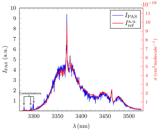 Broadband PAS absorption spectrum (blue) in arbitrary units (a.u.) for propane at for discrete values of . The normalized standard reference spectrum (red) was calculated from the absorption cross section in the HITRAN FTIR database. The average relative error, derived from the 1349 measured wavelengths, after correction for the contaminations, is 7.1(6)%, the lowest value of all three test gases.