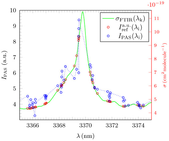 between the measured distributions and their corresponding, normalized reference spectra. The coefficient of determination of the EUREQA fit, was later used to help the deconvolution of simulated PAS absorption intensity spectra of mixed gas probes at ppm concentration level (see Section 4). Table 1 summarizes all the deduced crucial parameters for the three measured PAS spectra with c representing the concentration of the diluted test gas, the minimal wavelength which was examined and the maximum wavelength examined.
