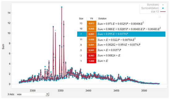 The simulated spectra were then fitted with the EUREQA program. EUREQA was instructed to search for a numerical combination of the simulated ethane and propane spectra, which leads to the lowest absolute error. To train EUREQA into the recognition of the specific pattern representing the expected PAS spectra of a test gas, the AI program was furthermore informed with the presumed wavelengths of single resonances and the associated uncertainties . Based on the information provided, EUREQA selects a subset of the presented data to minimize the absolute error and to recognize the expected pattern in case of the resonances. Another independent subset of data is then chosen by EUREQA to evaluate the quality of the fit. Applying this evolutionary data mining concept, EUREQA is able to leverage automated evolutionary algorithms and to create a final accurate predictive model as it will converge to a minimal absolute error. A typical output of the EUREQA program is given in Figure 8.