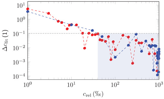 as obtained from the comparison between the EUREQA fit and simulated mixed ethane (red dots) and propane (blue dots) spectra based on the current measurements. For relative admixtures with EUREQA is able to retrieve the concentration with an accuracy better than (blue area). The dotted lines are depicted to guide the eyes.
