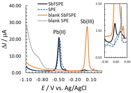 Figure 1). The background signal is low for both sensors in the potential range around the Pb(II) peak potential. There is a well-defined stripping signal for Pb(II) around −0.5 V for both the SbFSPE and bare SPE sensors. The advantage of using the Sb-film electrode compared to, e.g., the Bi-film electrode lies in its low oxidation stripping signal for Sb(III), as seen at a potential of approx. −0.15 V (for Bi(III) it would be significantly more intensive) [