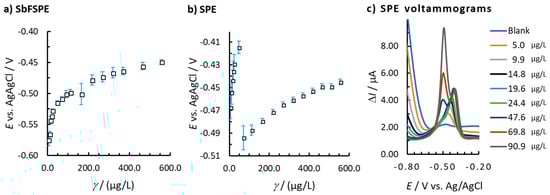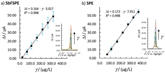 Figure 2b). For bare SPE, the 5.0–69.8 µg/L concentration range was also checked to determine if a second linearity existed, but the presence of such was not determined (the same was also checked for SbFSPE for concentrations lower than 24.0 µg/L and such linearity was not determined). Measurements were performed in triplicates; each point shown is an average signal and the corresponding error bars represent the standard deviation at each concentration point measured. The determined standard deviations are not large for the measurements with bare SPE, whereas they are relatively large for a single response at a certain concentration point for SbFSPE (the standard deviations also increase with increasing Pb(II) concentration). This could indicate a heteroscedastic data distribution and the need for the weighted regression. However, in the performed analyses three new sensors were employed, which could potentially mean that the sensors exhibit minor differences (e.g., a minor composition difference, slightly different measurement areas [