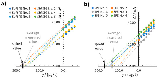 Figure 4 shows the results obtained by employing the multiple standard addition method using 12 completely new sensor electrodes (6 for analyses with SbFSPE and 6 for bare SPE). The measured (determined) value of the Pb(II) concentration should be considered as the value where the curve crosses the x-axis in