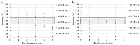 Figure 5a). With further use (from the third to fifth instance of use), the SbFSPE sensors mainly produced inaccurate results outside the 80–120% recovery range (the method was deemed to be accurate when the recovery was between 80–120% [
