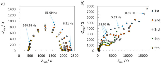 Figure 6 shows the Nyquist spectra measured after the accumulation step (repeated five times; at