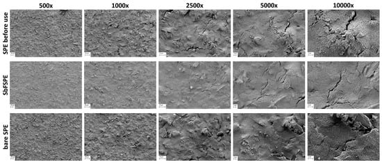 Figure 4 (measurements for three out of six sensors are presented). The surface morphology of all samples was evaluated at various magnifications to observe potential features and their distribution on representative scales. The surface morphologies of the bare SPE sensor before use and the SbFSPE sensor after five-time use, are similar regardless of the respective micrographs’ magnification. Both exhibit some minor cracks in the surface, which seem to be evenly distributed over the surface. On the other hand, the bare SPE sensor after five-time use shows a different morphology, which is the most evident at higher magnifications (2500× and higher). This electrode exhibits a higher surface roughness compared to the other two samples and partially exposed bigger materials pieces, which are not visible on neither the SPE sensor before use not the SbFSPE sensor after five-time use. Furthermore, it seems that at certain places on the working electrode surface, the carbon-based working material starts to peel off. This effect is more expressed for the bare SPE sensor. Based on these findings, we conducted AFM measurements to get further insight into potential differences on an even smaller scale (compared to the magnification of 10,000×).