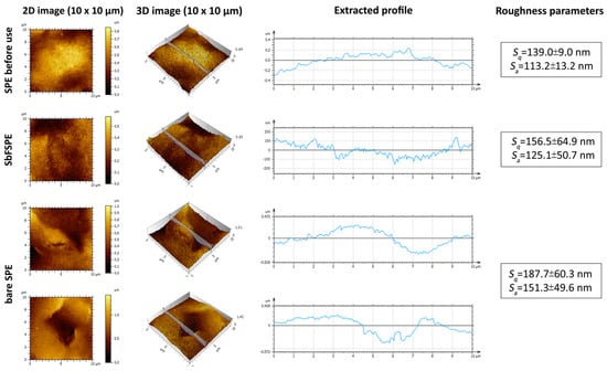 Figure 8), the SPE sensor before use and the SbFSPE sensor after five-time use, have a different topography compared with the bare SPE sensor after five-time use. For example, the obtained images reveal a small crack in the case of the bare SPE sensor after five-time use. Similar features were found at various parts of the same sample (only one is shown herein). This result is also in agreement with the above discussed results from the SEM measurements, where similar (more pronounced in the case of bare SPE sensor after five-time use compared to the SbFSPE sensor after five-time use and the SPE sensor before use) cracks were observed over the whole surface. Furthermore, the AFM images show a higher frequency of “valleys and mountains” for the bare SPE sensor after five-time use, which contributes to the higher roughness parameters calculated for this sample. Furthermore,