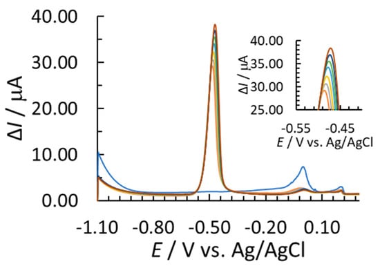Eaccu was set at −1.1 V for 60 s (pre-concentration step), followed by 15 s equilibration time, before starting the SWASV experiment. The SWASV measurements were performed using a positive-going square-wave potential scan in the potential region from −1.1 V to 0.3 V, with a potential step of 4 mV, an amplitude of 25 mV, and a frequency of 25 Hz [