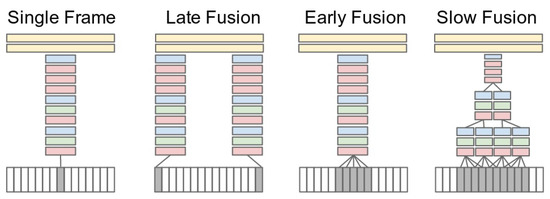 Research has been focused on how to successfully incorporate the time dimension in deep networks. Ng et al. [95] have worked on the idea of temporal pooling and showed that max pooling provides the best results. Karpathy et al. [96] created different models for combining information from spatial and temporal domains; early fusion, late fusion and slow fusion; see Figure 7 for a reference. The single-frame approach uses one frame and applies a deep architecture over it without using temporal information. In late fusion, two images a certain number of frames apart are fed to two independent networks, fusing the results at the fully connected (FC) layers. Early fusion merges the frames at the pixel level before running them through a network. Slow fusion is an amalgam of late fusion and early fusion. The procedure requires the convolutional layers to be connected across multiple frames, thus providing the benefit of temporal convolution along with spatial convolution. Among the three, slow fusion performs better than the others because of its use of 3D convolutional kernels across multiple layers. Karpathy et al. have also experimented with multi-resolution models by creating a two-stream network. The ‘context’ stream processes a low resolution complete image, and a ‘fovea’ stream processes a high resolution cropped center of the image. The results of convolutions on both streams are combined at fully-connected layers to produce classification results. Using multi-resolution videos in separate, but identical networks reduces the number of parameters to learn and improves the accuracy [96]. Tran et al. [97] also used 3D CovNets while making use of a small 3 × 3 × 3 convolutional kernel throughout the network and showed that constant depth at every layer performed better than varying the temporal depth at each layer. This network, named C3D, gives rise to a generic descriptor, that averages the outputs of the fully-connected layers, with the aim of learning generic features from video, so that the network would not have to be fine-tuned for each independent task [97].