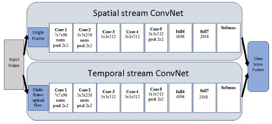 Multi-stream models have been built on the idea of the separation between the spatial domain and temporal domain. Simonyan et al. [102] introduced this idea of multiple streams where they trained one convolutional network to extract spatial information about the video frames and another to capture temporal information using optical flows [103]. The two streams were later ‘fused’ using their softmax rates, as shown in Figure 8. They [102] have worked with layers of dense optical flows of consecutive frames, motion trajectories and bi-directional optical flows. The convolutional neural network is trained in a multi-task learning setting [104] by classifying both on the HMDB-51 and UCF-101 datasets and using two softmax layers, each of which computes a score on its respective dataset. Both streams are trained in the same manner, where the temporal network is an adaptation of the model by [105].Fiechtenhofer et al. [106] have shown improved results with a similar architecture that performs fusion at an intermediate layer.