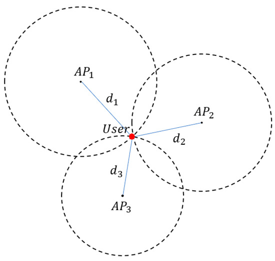 Trilateration is the most typical method for localization. It uses the distance among devices in a two-dimensional plane, as shown in Figure 1. The coordinates of APn and a user are denoted as (xn, yn) and (x, y), respectively. The distance between them is dn, and this can be derived from Equation (7).
