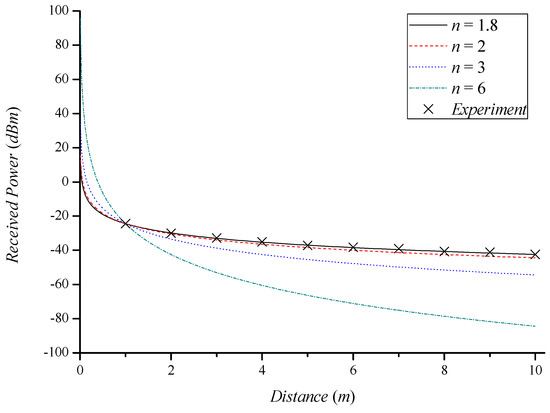 Figure 2 shows the RSSI as a function of distance, where each line is derived by Equation (6), and X marks indicate the experimental results in the LOS propagation path. The experimental environment was the same as for the performance evaluation in Section 5. As the path loss exponent becomes larger, the received power difference increases with distance. This proves the effect of shadowing on the received power. The experimental result in the LOS propagation path and the theoretical result where n is 1.8 are similar to each other. This verifies that the real received power follows the log-distance path loss model.