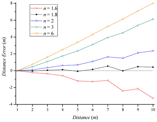 Figure 3 shows the distance errors for different path loss exponents as a function of distance. We constructed an indoor LOS propagation path to collect RSSIs. The RSSI value collected at each distance was substituted into Equation (7) to obtain the estimated distance for different path loss exponents. As shown in Figure 2, the path loss exponent in an indoor environment was close to 1.8. As n used for the distance estimation was closer to the path loss exponent of the experimental environment, the distance estimation error was smaller. The experimental result shows that the smallest distance error occurred when we selected a path loss exponent of 1.8 for the distance estimation. This result verifies that selecting the path loss exponent corresponding to the propagation path is important for increasing the accuracy of distance estimation.