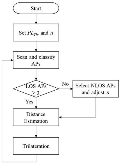 In an indoor environment, many WiFi APs periodically transmit beacon frames to each channel in order to inform nearby WiFi stations of their presence (e.g., smartphones). We used WiFi technology for indoor localization, which does not require additional infrastructure. Figure 4 shows the flowchart of the proposed indoor localization algorithm. Before starting the indoor localization, the smartphone first sets path loss thresholds and path loss exponents according to each propagation path. According to the path loss difference in Equation (12), the smartphone determines the propagation path with each AP. The propagation path is classified as follows: