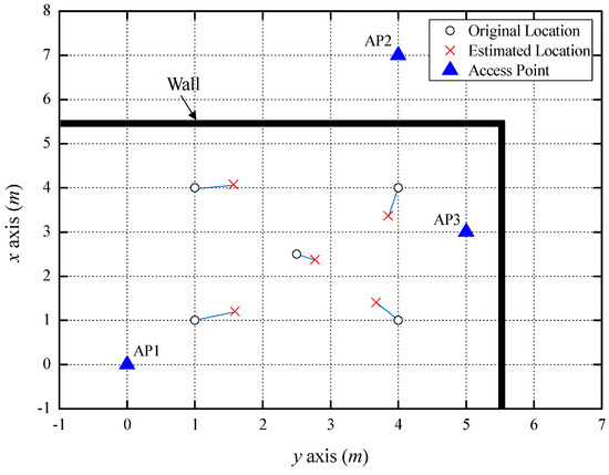 Figure 5 indicates the indoor localization results from the experiment using three LOS APs. For this experiment, we installed three APs and estimated the location of the smartphone in a room. The smartphone measured the RSSIs of the beacon frames received by each AP in the 2.4 GHz and 5 GHz bands. The RSSI difference between the 2.4 GHz and 5 GHz bands (ΔRSSI) was compared with the path loss threshold from Equation (13). Because the ΔRSSI for all APs did not exceed PLThr1, the smartphone regarded the propagation path as LOS and estimated d from Equation (6). The average value of the estimated distances in the 2.4 GHz and 5 GHz bands was taken as the distance between the AP and the smartphone. The estimated distance errors at AP1, AP2, and AP3 were 0.27 m, 0.2 m, and 0.18 m, respectively. As a result of trilateration using the estimated distances, the average localization error was found to be 0.36 m at five coordinates. The error dropped to 0.07 m at the middle of the three APs (2.5, 2.5). Table 2 indicates the positions and errors estimated from the five coordinates.