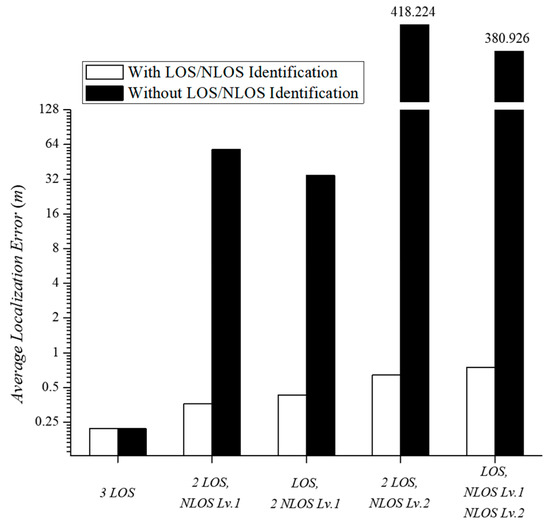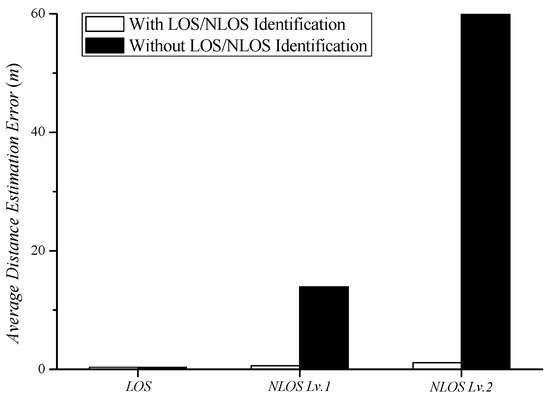 Figure 8 shows the average distance estimation error along different propagation paths. Figure 5, Figure 6 and Figure 7 show the average distance estimation error along each propagation path. Traditional distance estimation methods do not consider whether the propagation path is LOS or NLOS; hence, they only use an LOS path loss exponent. If the real propagation path is LOS, then distance can be estimated with a low level of error. In the case of NLOS, the traditional distance estimation generated a large error causing it to exceed the experimental space (10 m × 10 m). Because the estimated distance is derived by Equation (6), it can go beyond the experimental space. The NLOS path has a large difference between the LOS path loss exponent and the real path loss exponent. The estimated distance is proportional to ; thus, the use of the wrong path loss exponent, n, can cause a large error. The error caused by the NLOS level 2 AP is much larger than the error caused by the NLOS level 1 AP because the path loss exponent difference is large in the NLOS level 2 AP. In traditional distance estimation, the distance estimation error becomes larger as the number of NLOS APs or the difference in the path loss exponents increases. The proposed distance estimation method identifies LOS and NLOS using Equation (13). It finds and uses a proper path loss exponent according to the estimated propagation path. As in Figure 8, the proposed distance estimation method yields errors within 1.25 m, regardless of the propagation paths considered in trilateration.
