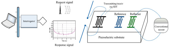Figure 1. The SAW transponder is composed of several interdigital transducers (IDTs), one of which is used as a transmitting/receiving IDT responsible for transmitting and receiving wireless signals and the others are used as reflectors. One of the reflectors is loaded with conventional sensors whose varying impedance can be of any type, resistance, capacitance, or inductance. The wireless interrogating electromagnetic wave signal is received by the antenna and transformed to a surface acoustic wave by the transmitting/receiving IDT. The surface acoustic wave propagates along the substrate surface and is reflected by the reflectors. At the same time, the reflection coefficient would be influenced by the externally loaded sensors impedance. The returned surface acoustic wave is transformed back into an electromagnetic (EM) wave by the transmitting/receiving IDT and sent by the antenna. By changing the impedance of outside conventional sensors (electrical boundary condition), the scattering parameters S
