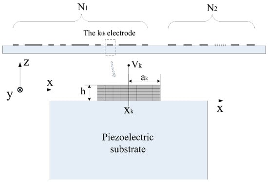 Vk. Because stress and charge distributions are zero outside the electrode-substrate interface, the three components (mechanical displacement, u; stress vector, t