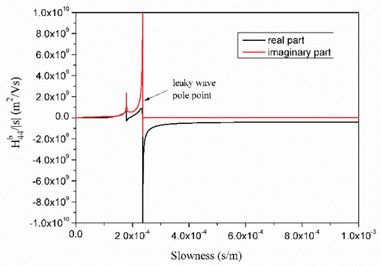 3 on which the leaky wave exists. There are still some sharp changes and turns near the leaky wave pole point and branch points after removing the surface wave part of the Green’s function. The function must interpolate in several intervals in the slowness domain to ensure accuracy and lower interpolation expansion numbers. The larger the amplitude of function variation, the greater the interval number. As shown in