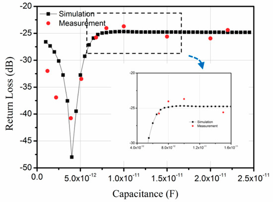 21]. The calculated curve corresponds with the trend of the measured points. In the range of 7–12 pF, there is a small ripple in the measured points which can also be seen clearly in the magnified view of the simulated curve. The simulated results are approximately 5 dB lower when the capacitance is 1 pF and 7.5 dB lower for a 2 pF value. This may be because when the capacitance value is small the bond wire effect can easily affect the measured results.