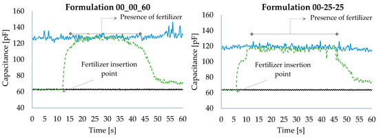 The formulations 00-00-60, 02-28-20 and 06-21-12 were seen to present mean capacitances which were very close one to each other; however, when analyzing the sample moisture, they were seen to be significantly different, influencing the capacitance presented by the sensor. The same occurred with the formulations 02-24-12 and 04-24-12; however, these were only different one from another due to the amount of nitrogen in their formulation, which might explain the closer capacitance values of these two formulations.
