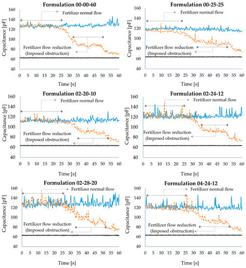 Figure 7 illustrates the results obtained by the imposition of an obstruction at the fertilizer input aperture in the dosing mechanism, provoking a reduction in the pre-set normal flow. The graphs show three curves: the upper and lower curves (black and blue) refer to the absence and presence of fertilizers, respectively. The central broken-line curve (orange) presents the capacitance variation due to the reduction in the fertilizer flow due to the obstruction created.