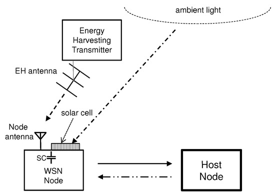Scavenging energy is feasible, e.g., from dedicated RF energy harvesting transmitter and solar cell as is shown in Figure 1. The harvested energy is then used to operate energy harvesting transceiver (WSN Node) and communication link between energy harvesting transceiver and receiver (Host Node) can be established. In addition, the Host Node may harvest the energy from the energy harvesting transmitter and ambient light. Thus, the energy sources provide essentially efficient operational assets for large number of devices within their range. Typically, the possible excess harvested energy by the transceiver is stored for later use.