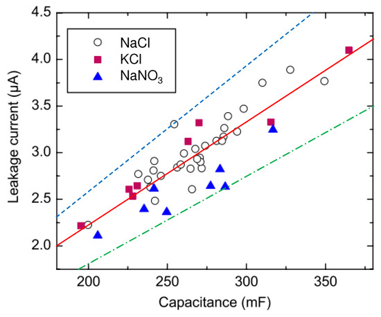 Leakage current behavior with respect to supercapacitor capacitance introduced in [18]. Corresponding median fitted line with (—), is shown and additionally upper limit behavior (- - -) and lower limit behavior (- . - . -) may be seen.