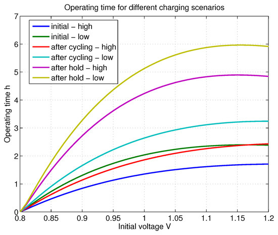 An example illustration of operational times when using different charging scenarios with respect to initial charging voltage level.