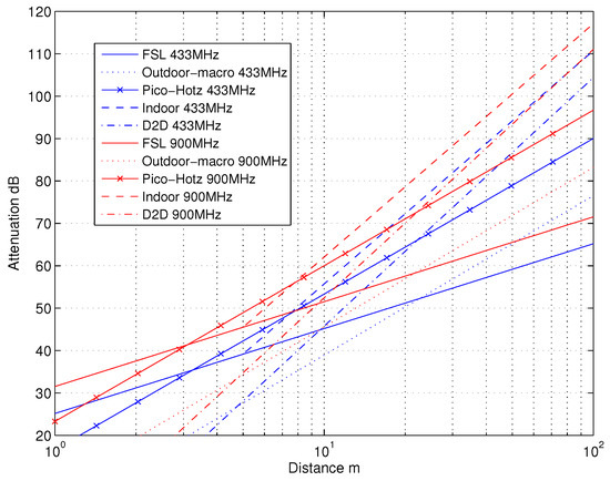 Here, IEEE 802.11ah channel models [56] are used to model a multitude of M2M communication scenarios, incorporating outdoor with macro, outdoor pico/hotzone deployments, indoor, and outdoor Device to Device (D2D) use cases as shown in Table 3. In outdoor macro antenna height is assumed 15 m above rooftop, whereas in pico/hotzone deployments antenna is assumed at rooftop level. For outdoor D2D path loss, antenna height is assumed 1.5 m. In indoor path loss case, the model is valid for single floor scenario and the exact antenna height is not specified, but can be typically in practise assumed to be less than 3 m. The typical path lengths for the models are some hundreds of meters, but for macro channel even several kilometers. For other center frequencies, f, a correction term of 900 MHz) should be added. For completeness, the Free Space Loss attenuation [57] is given by