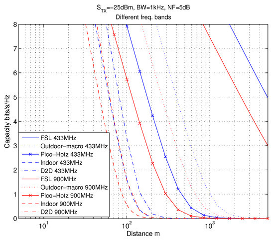 Here, in the numerical evaluations, we specifically focus on the license-exempt ISM bands at 433 MHz and 900 MHz (sub-1GHz), due to their good suitability for low-power communications and being free from spectrum licensing related constraints. The lighting level is assumed to be as defined for working and processing environment (rough assembly) [58], i.e., 200 lx . The principal path loss behaviors in the considered use cases versus the communication distance, d, are illustrated in Figure 5 at these two frequency bands. The path loss of indoor channel A with shown in the figure, is the most demanding channel in path loss sense. Thus, this channel case will be considered in the continuation for path loss modeling. Moreover, the capacity (3) can be evaluated for the considered channels. As can be seen in Figure 6, e.g., in Indoor A channel when = dBm and the capacity requirement is 2 bits/s/Hz, the maximum communication distance is 70 m at 900 MHz. For 433 MHz the distance will be increased by roughly 20 m, in this case. Similarly for 1 bit/s/Hz capacity, the distances will be 90 m and 110 m, correspondingly.